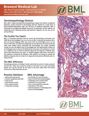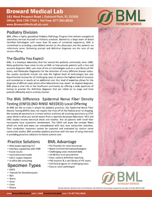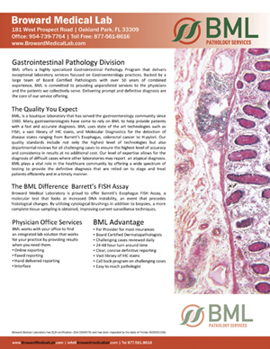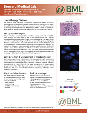 Broward Medical Laboratory is a full service pathology laboratory specializing in Podiatry, Urology, Gastroenterology and Dermatology since 1980. BML is considered an expert at FISH technology, with veteran specialty pathologists reading every FISH case.
